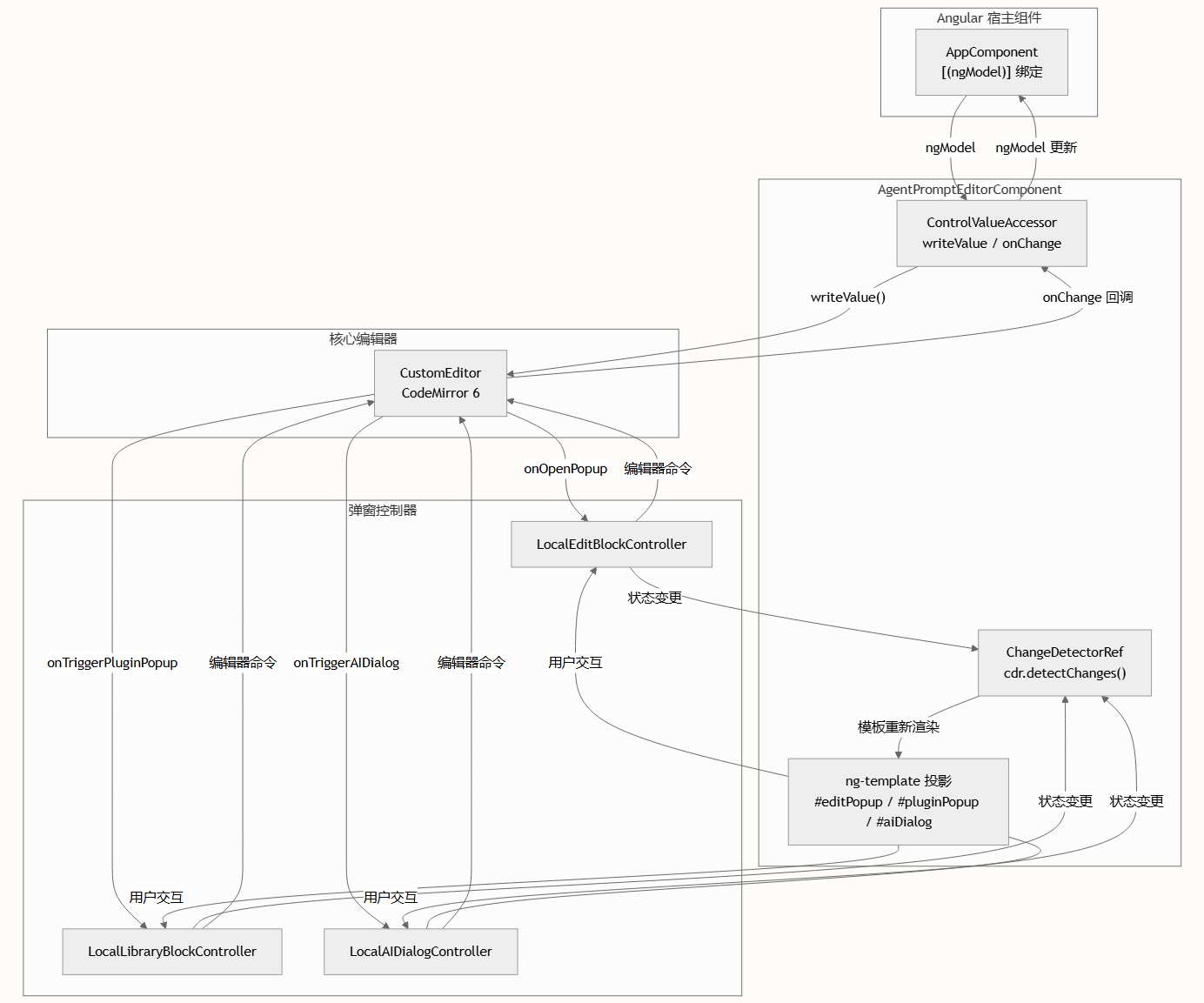 每个弹窗控制器(LocalEditBlockController、LocalLibraryBlockController、LocalAIDialogController)都在 ngOnInit 中实例化,这些实例化的回调会更新上述状态属性,并调用 cdr.detectChanges() 以手动触发 Angular 的变更检测。