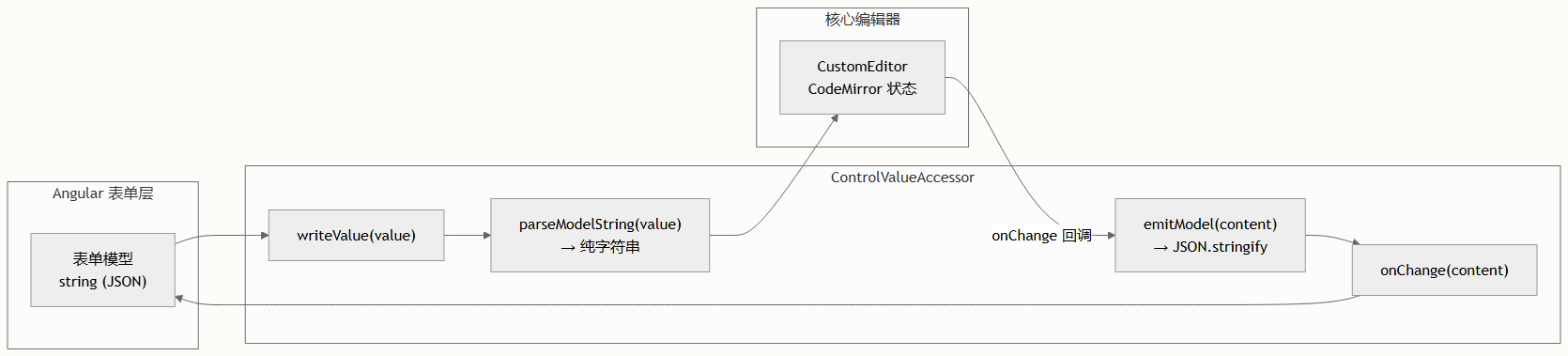 writeValue 方法从 Angular 表单层接收一个 JSON 字符串,将其解析为供编辑器使用的纯字符串,并通过 recreateEditor 应用——销毁现有的 CodeMirror 实例并使用新内容重新创建。suppressModelEmit 标志用于防止在程序化写入期间发生循环更新。