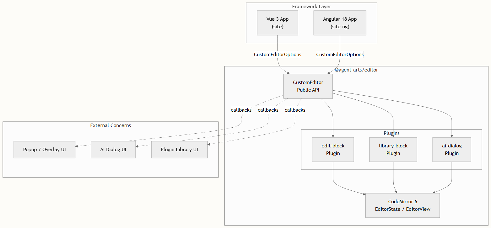 @agent-arts/editor | 编辑器库(已发布至 NPM) | 无(原生 TS) | — |