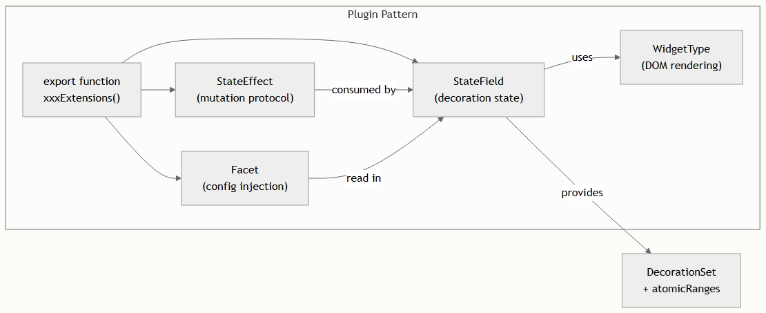 每个插件遵循相同的架构模式:一个 StateField(或一组 StateFields)管理块装饰,StateEffects 定义用于变更的事务协议,而 WidgetType 子类则渲染替换文档中文本范围的 DOM 元素。