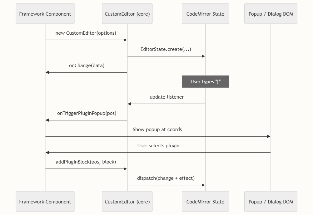 在最高层面上,编辑器遵循回调委托架构:核心引擎处理所有文档建模、块生命周期和文本操作,同时通过定义良好的 options/callback 接口,将所有视觉呈现问题(弹窗、对话框、覆盖层定位)委托给宿主框架。