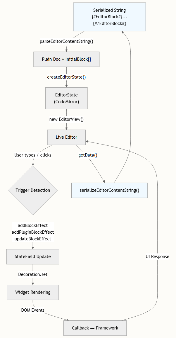 initialDoc字符串(可能包含序列化的块标记,如{#EditorBlock ...#})由parseEditorContentString()解析为一个带有 Unicode 对象替换字符(\uFFFC)占位符的纯文本文档,以及一个将位置映射到块元数据的InitialBlock描述符数组。 - 状态创建 —
