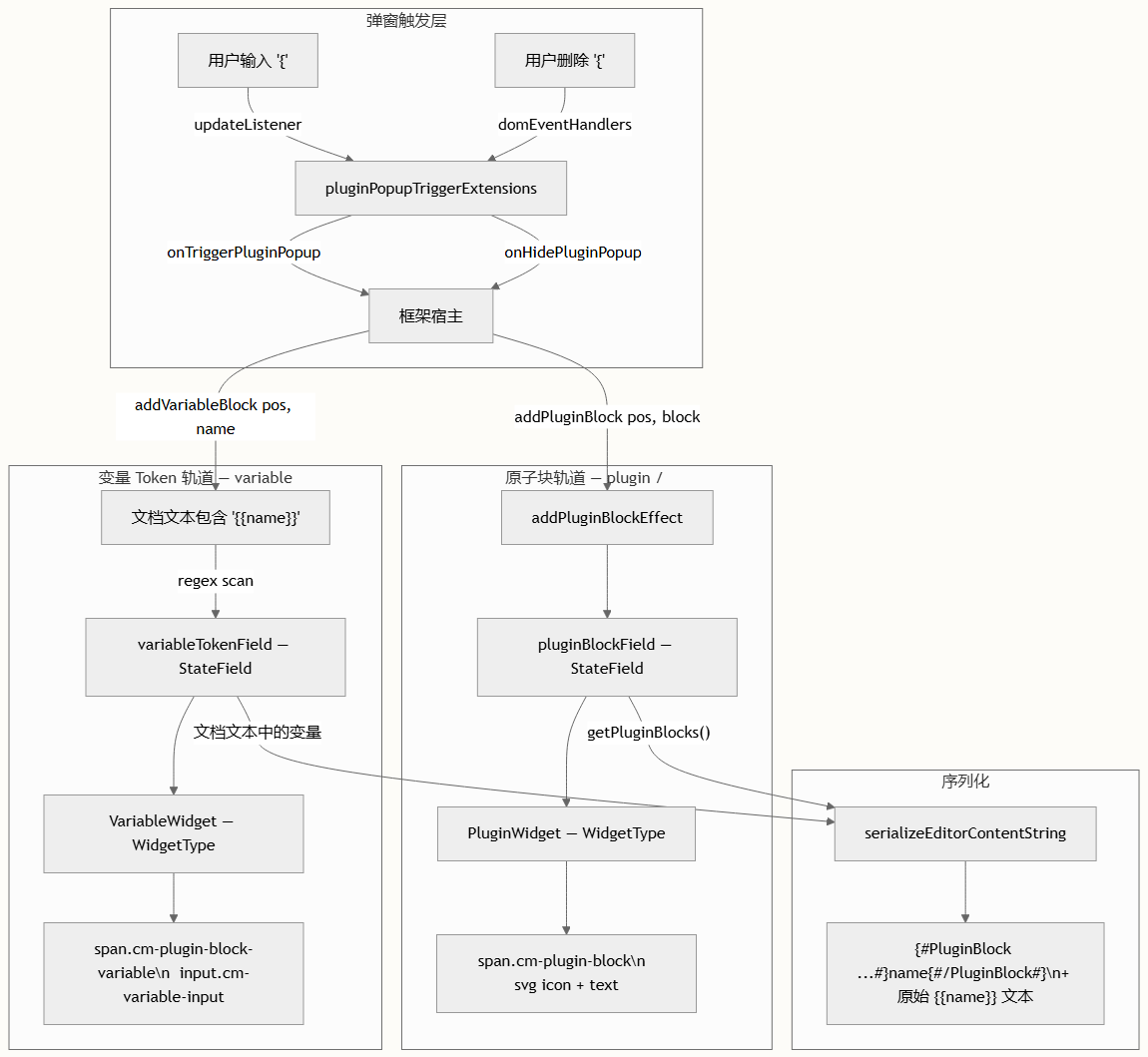 | 序列化形式 | 块类型 | 反序列化路径 | | {#PluginBlock id="..." type="plugin"#}name{#/PluginBlock#} | Plugin | parseEditorContentString → initialPluginBlocksFacet → pluginBlockField | | {#PluginBlock id="..." type="workflow"#}name{#/PluginBlock#} | Workflow | parseEditorContentString → initialPluginBlocksFacet → pluginBlockField | | (原始文本) | Variable | 初始化时由 variableTokenField 进行正则扫描 |