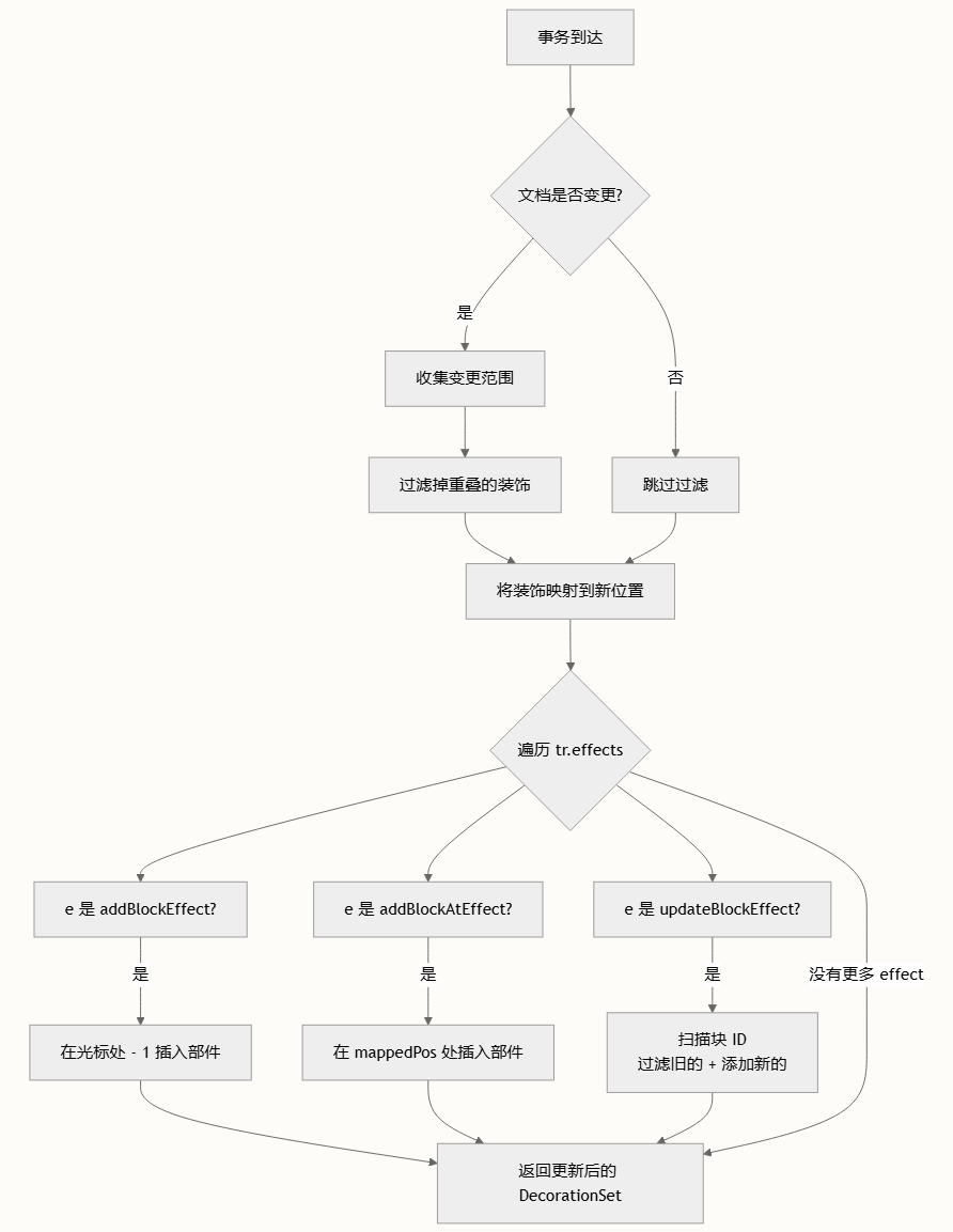 更新策略:更新处理程序按顺序处理变更和 effect,这对于正确性至关重要。首先,它跟踪发生变更的文档范围,并移除与这些范围重叠的任何装饰——这可以防止过时的部件在文档编辑后继续存在。然后,它通过 decorations.map(tr.changes) 将存活的装饰映射到新位置。最后,它遍历 tr.effects 来处理所有传入的命令。